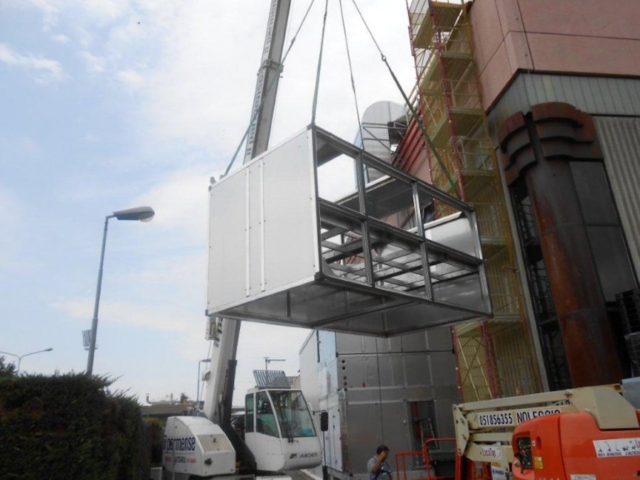 The resulting AHU has been installed adjacent to the shorter side of the warehouse where pharmaceutical items are stocked (the client is the well-know company 'Chiesi Farmaceutici'), so that it should occupy the smaller possible space, destined to the handling of the goods, and which should simplify the installation of the ducts.