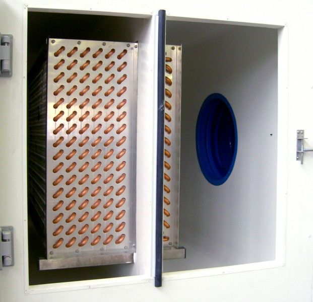 Fan and absolute filters section: Constituted by a directly-coupled ‘plug’ fan (to avoid the micro losses of particles from the belts, typically used with the traditional centrifugal belt/pulley transmission) with special food-process epoxy coating and, upon request, a final stage of absolute HEPA filters class H13 (normally recommended for air-handling units destined to ham-slicing areas and alike).